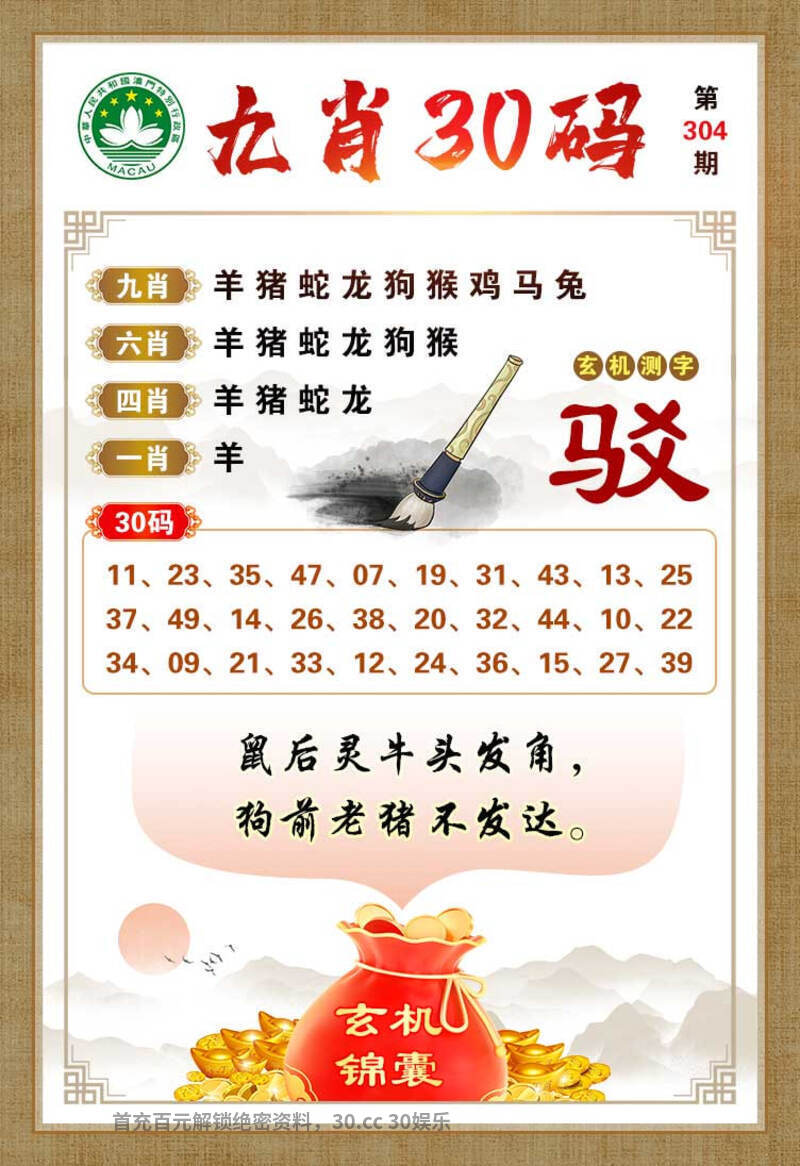 | 304期:九肖 | 鼠虎鸡蛇龙羊狗猪马 | 开:马48 |